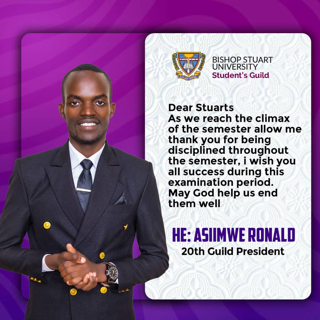 “Dear Stuart’s, Greetings from Our HE Asiimwe Ronald Wishing you success during this examination period! May God help us end them well. “ Reclaiming Ours Post navigation Previous Post Elementor #2846Next PostMessage from the Guild Speaker Rt Hon Allan Muhandiiki to all students